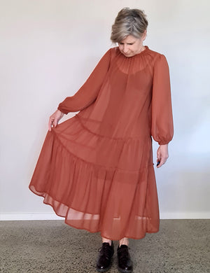 This does depend a little on the drape and weight of your fabric, and your desired finished lookl, but we recommend a gather ratio between 1.5 and 1.7 times the layer above. The rust coloured gorgette in the Egret dress above has layers gathered at 1.5x and the Heron dress sewn in a rayon was gathered at 2x.
