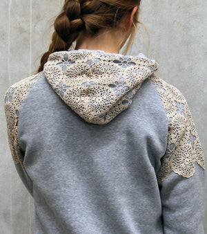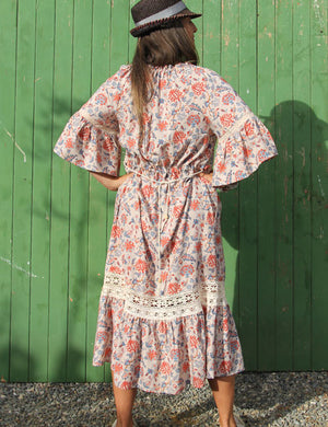 Adding lace on the gather, or just above it can also add something a little extra. The example below is on a Heron Dress we hacked by adding a low long tier and lace at the bottom of the tier above. We repeated this on the sleeves (using the 2 piece sleeve pattern). We also shortened the sleeve and left it ungathered. This versionof the Heron Dress used the back gather channel with waist drawstring.